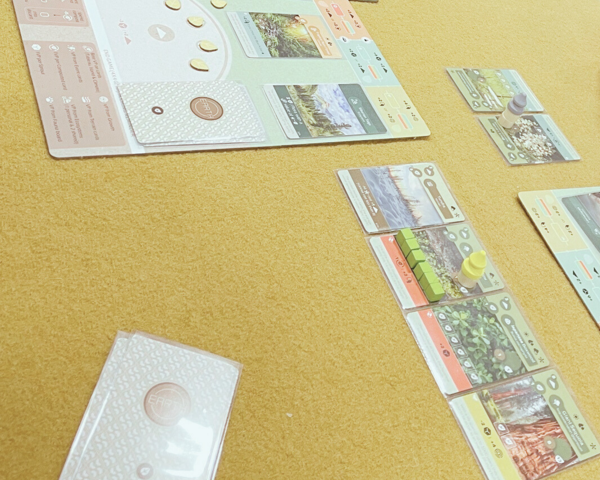 Each turn, you pick an action—planting, composting, watering, growing. Everybody else gets a smaller version of that action too. You’re slapping down flora and fauna in a neat little 4×4 grid tableau, triggering powers, composting cards for points, and watching your ecosystem explode with combos. Basically, you’re building a goblin greenhouse… only less likely to collapse in fire.
