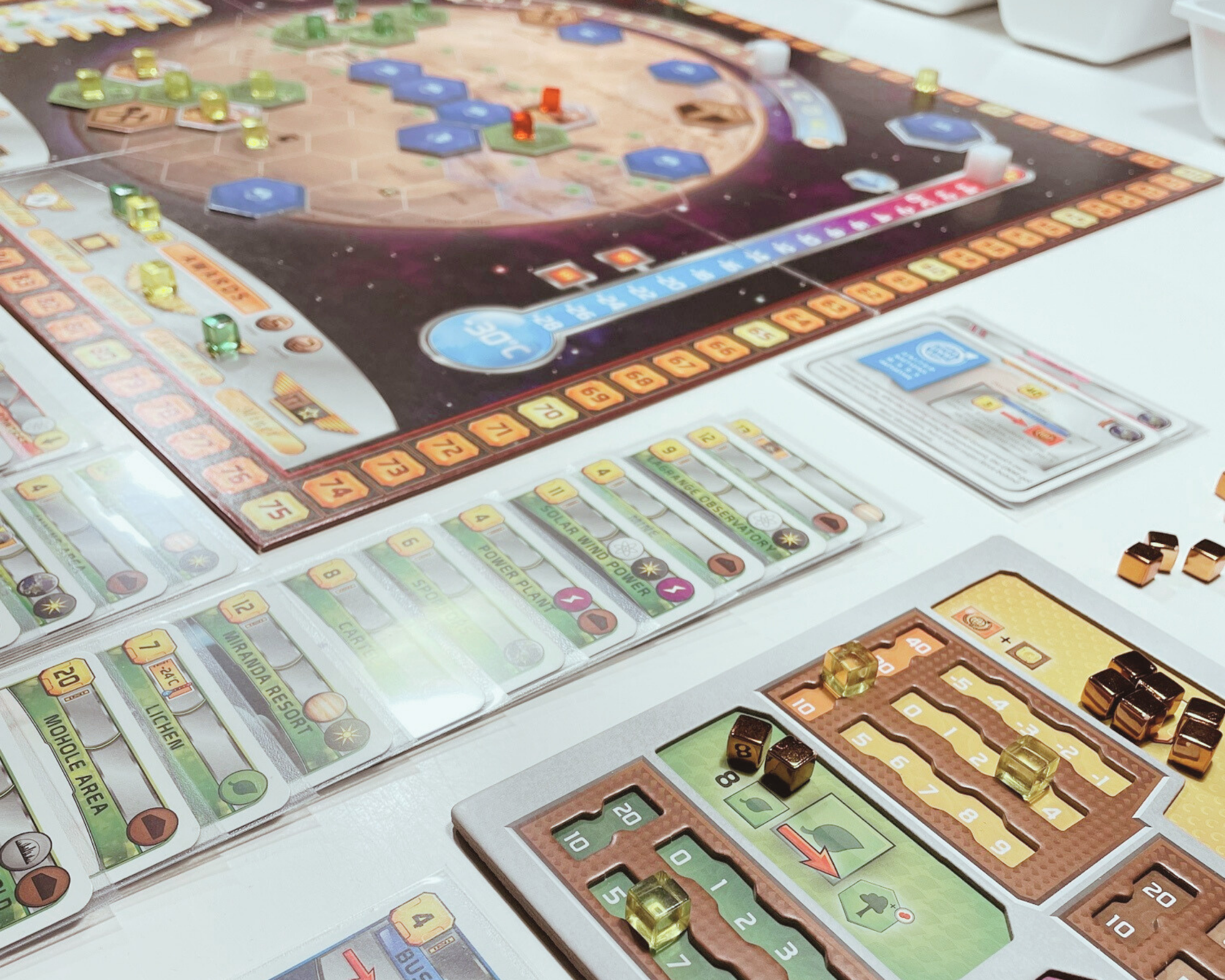 You get your own little corporation, some shiny project cards, and a handful of resources—plants, heat, steel, and so on. Sounds fine until you realize EVERYTHING costs a fortune. Want to build a forest? Pay up. Want an ocean? More coin. Want to shoot down your rival’s space station? Still more coin! My goblin purse weeps by turn two.